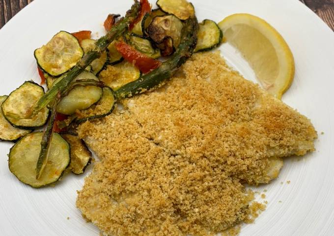 - Passez le poisson sous l’eau et séchez-le avec du papier absorbant. Placez-le dans le plat de légumes et saupoudrez-le de crumble et faites cuire pendant 15/20min (selon le poisson). Dégustez avec un filet de citron !.