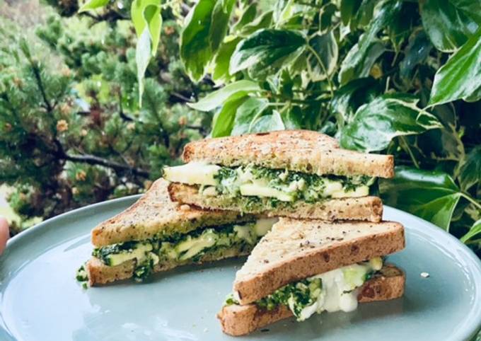 - Pour l’assemblage : pain de mie + pesto + rondelles de courgette + rondelles de chΓ¨vre + pesto + pain de mie..