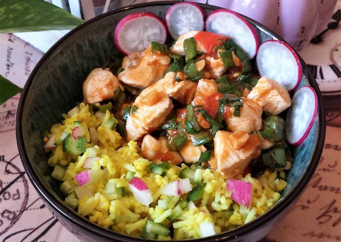 - Laisse un peu réduire la sauce à feux doux. Pendant ce temps, incorpore le concombre et les radis dans le mélange de riz & millet..