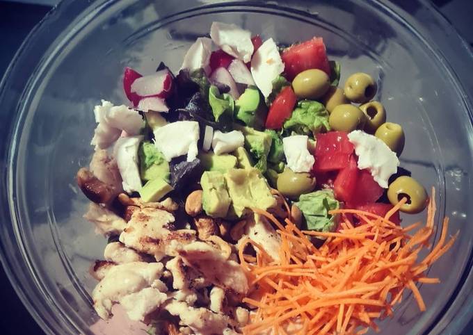 - Déposer la salade au fond de votre plat ajouter tout vos ingrédients par desus mettre votre vinaigrette c'est prêt.
