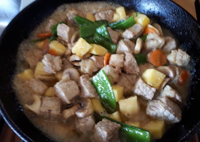 - Toujours sur feu vif, ajoutez les légumes et les morceaux d'ananas et rajoutez de l'eau et continuer la cuisson sur feu doux..