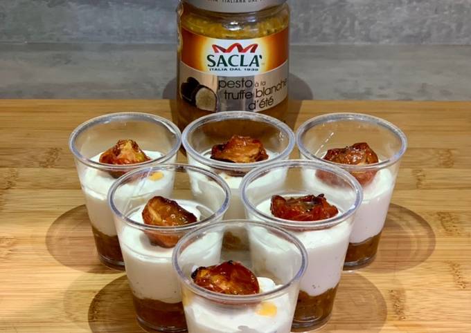 - Dans des verrines, disposez une couche de Pesto à la truffe blanche Sacla..
